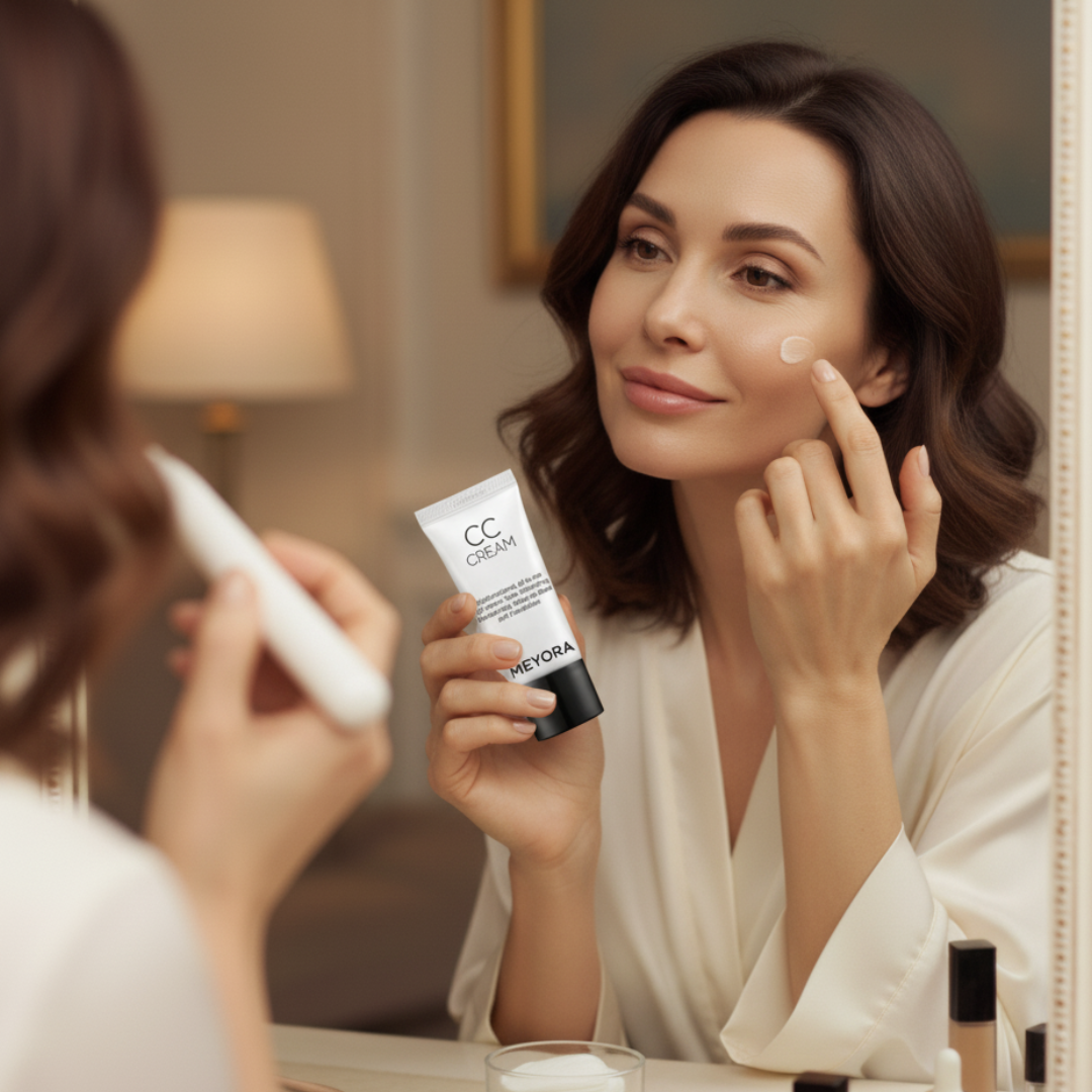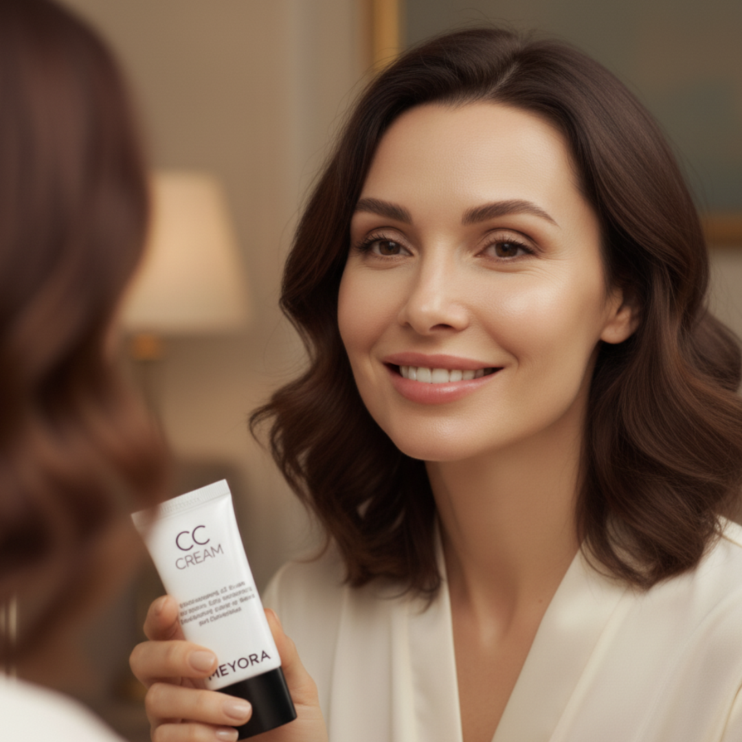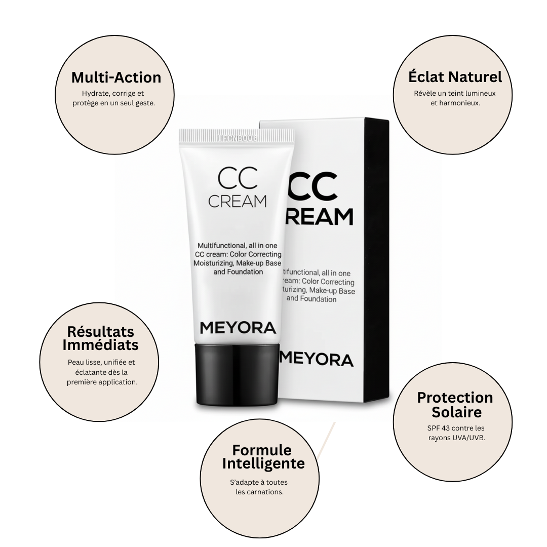 Découvrez l’innovation beauté la plus remarquable avec la Meyora CC Cream SPF 43 — une crème multifonction tout-en-un qui corrige le teint, hydrate, prépare la peau et unifie le visage.